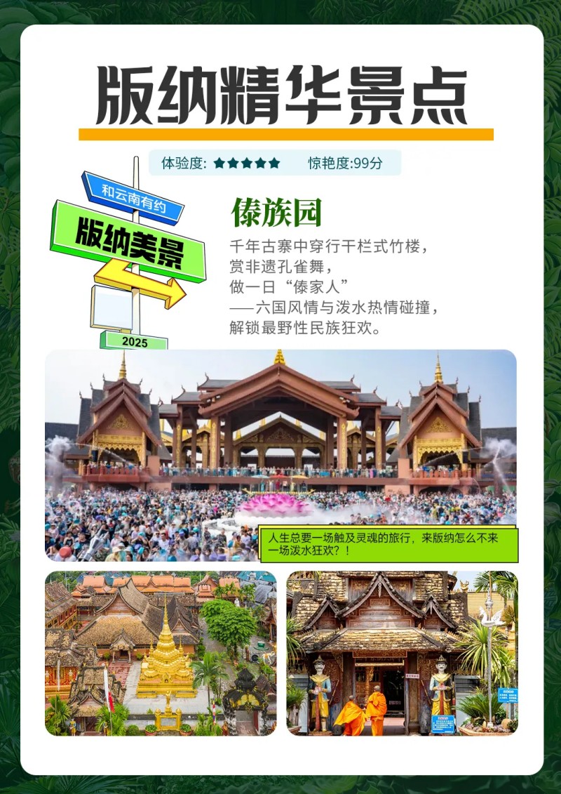 下午:后乘车前往【傣族园】(不含电瓶车60/人,游览时间:120分钟) ,西双版纳傣族园是国家AAAA级风景区,由五个保存最完好的傣族原始自然生态村寨组成, 是西双版纳傣民族的缩影,浓缩了傣民族文化的精华,展现了典型的热带田园风光 ,今天将会带大家参加《天天欢度泼水节》大型民俗歌舞泼水系列活动,全新的泼水设备设施:水枪、喷泉、水立柱等,让无数来自五湖四海的游客朋友体验天天泼水的畅快。同时传统游演仪式结合当下流行的傣迪文化带给游客独特的泼水体验,相信傣族园一定能让您感受到傣族人民的热情。(若想参加泼水的贵宾,请自备好一套更换衣物,泼水工具可现场租赁)