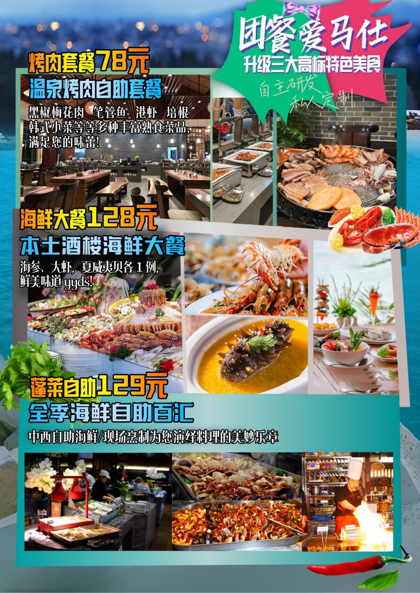 全程安排54正餐三餐自助,东浦湾海鲜自助128元,全日制海鲜自助118元,全季海鲜自助百汇129元大连满汉宴席50元。注明:自助餐为赠送美食,不吃不退。酒店早餐为团队房价包含,酒店配送,不吃不退。因团费为综合报价,游客个人原因临时放弃用餐,费用均不退还如遇不可抗力特殊原因无法用餐,则按照折扣优惠价退款。自助餐达不到最低开餐人数,则改为同标准的桌餐。菜量视人数多少增减。