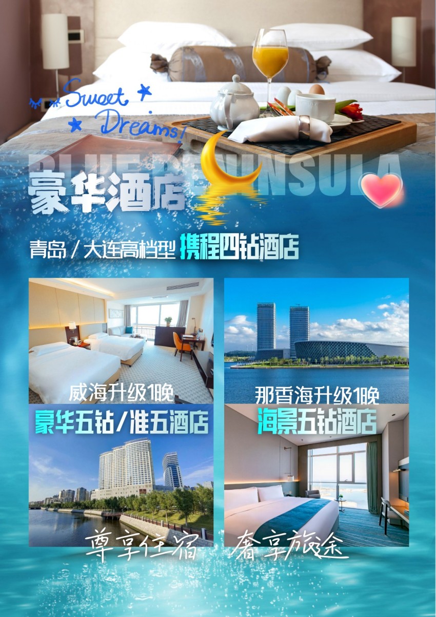 住宿安排:青岛威海、大连携程四钻酒店】,荣成1晚豪华【海景五钻酒店】。住宿安排双人标准间,酒店不提供自然单间,如产生单人房差请游客自付或安排三人间或是家庭房。(提醒游客:全程酒店入住匙牌押金及酒店内消费客人自理)。以上参考酒店,安排入住其中一家。由于旅游旺季和节假日期间或特殊原因,房源紧张,会安排其他的不低于以上住宿标准的住房。