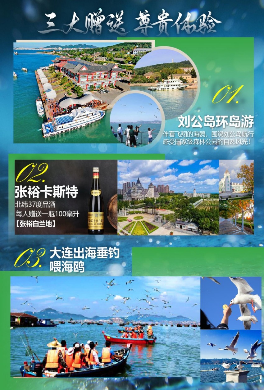 含行程所标景点的首道门票:海上嘉年华+赶海拾贝388元(赠送项目),沙滩糖潮+鱼子酱缤纷下午茶98元(赠送项目),神游传奇演艺249(赠送)刘公岛环岛游60赠送,威海刘公岛122元,威海神游海洋世界160元,蓬莱八仙渡80元大连金石滩地质公园60元,金石滩海洋牧场200元(赠送景点,不去不退)不包括景区内另行收取的费用。旅游团费为综合价格,因特殊原因景区不开,可以置换同价景区或是按照协议优惠价退款。个人原因景区未去,费用一律不退。持优惠证件均不享受优惠,不退门票。