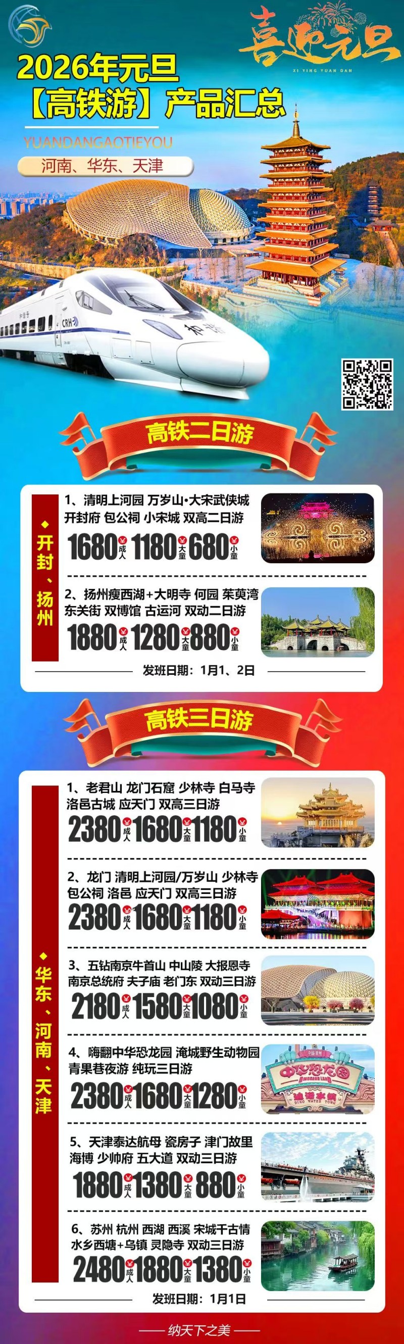 线路编号:L1033685 咨询:13506487734张群,元旦高铁哪里玩,开封、扬州、华东、河南、天津 [ 青岛 多地收客]